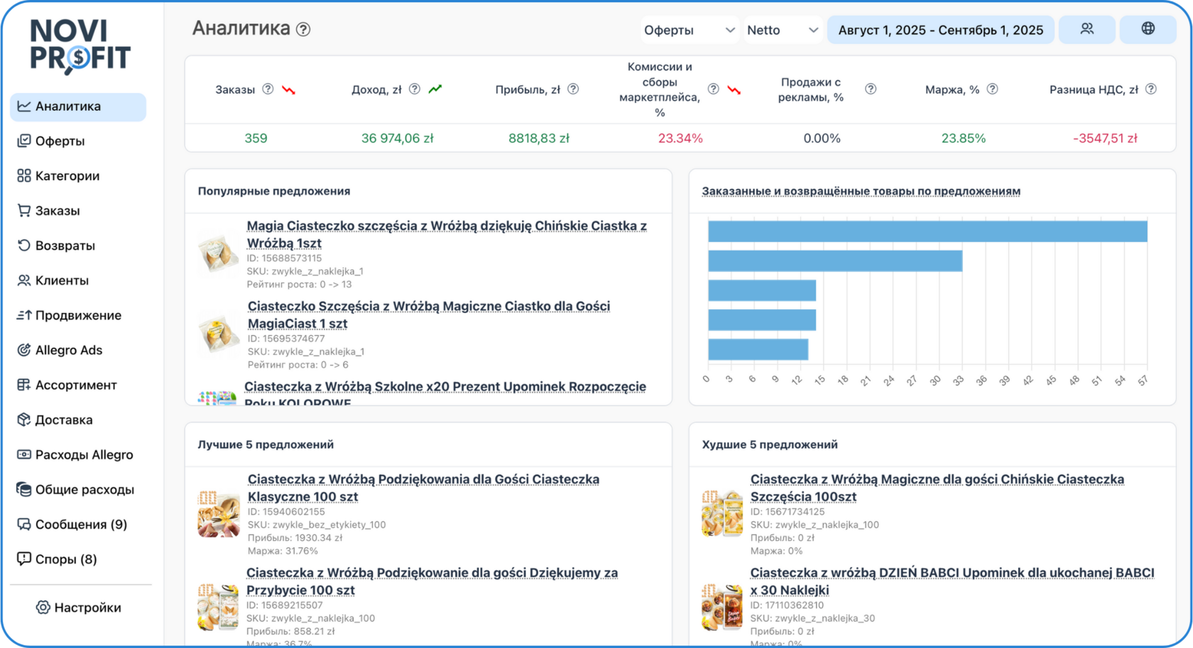 Видишь всю картину бизнеса: прибыль, эффективность Allegro ADS, комиссии, расходы, возвраты — ничего не скрыто.